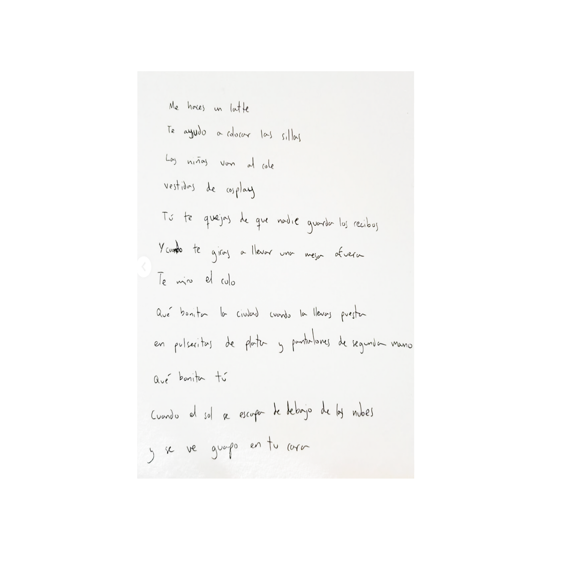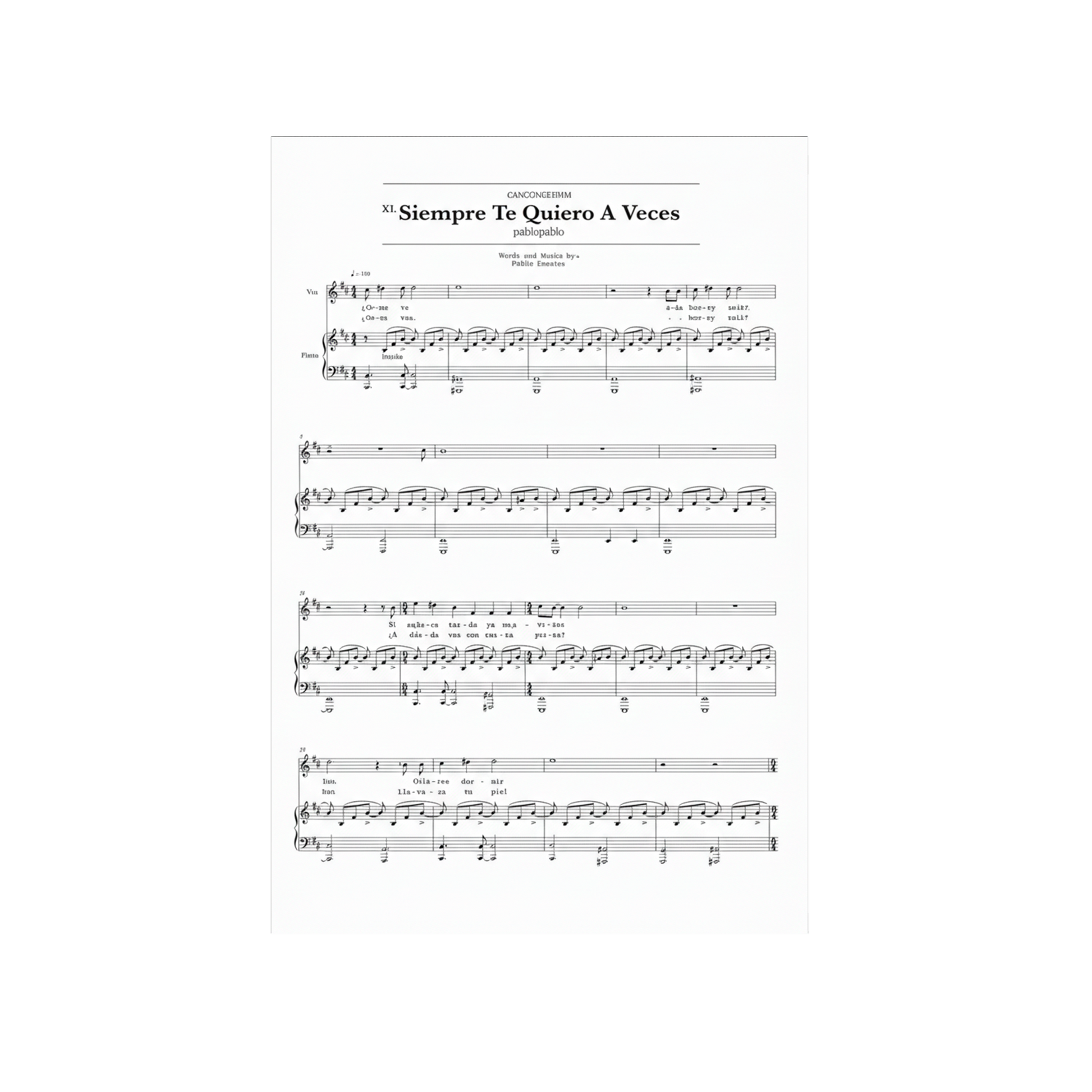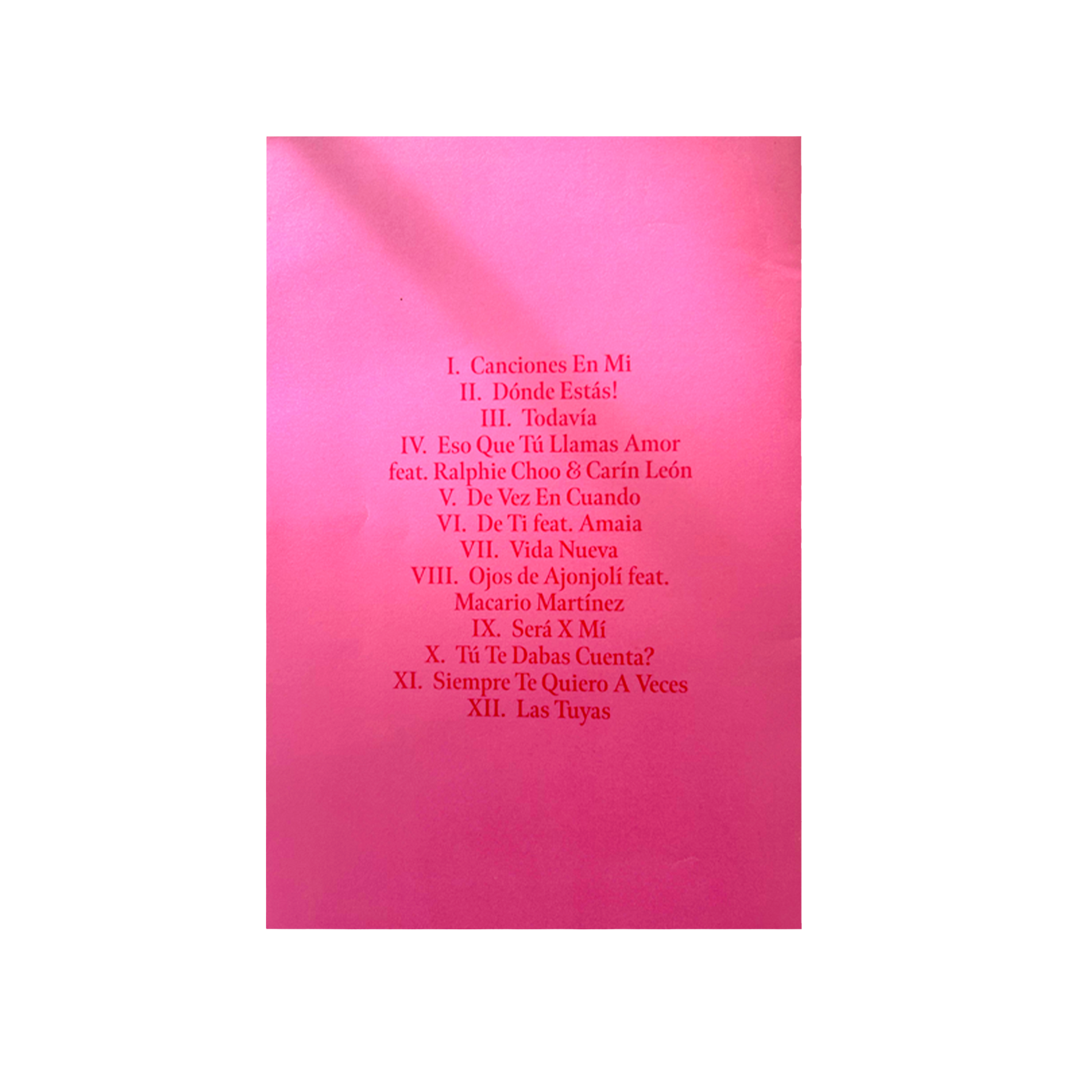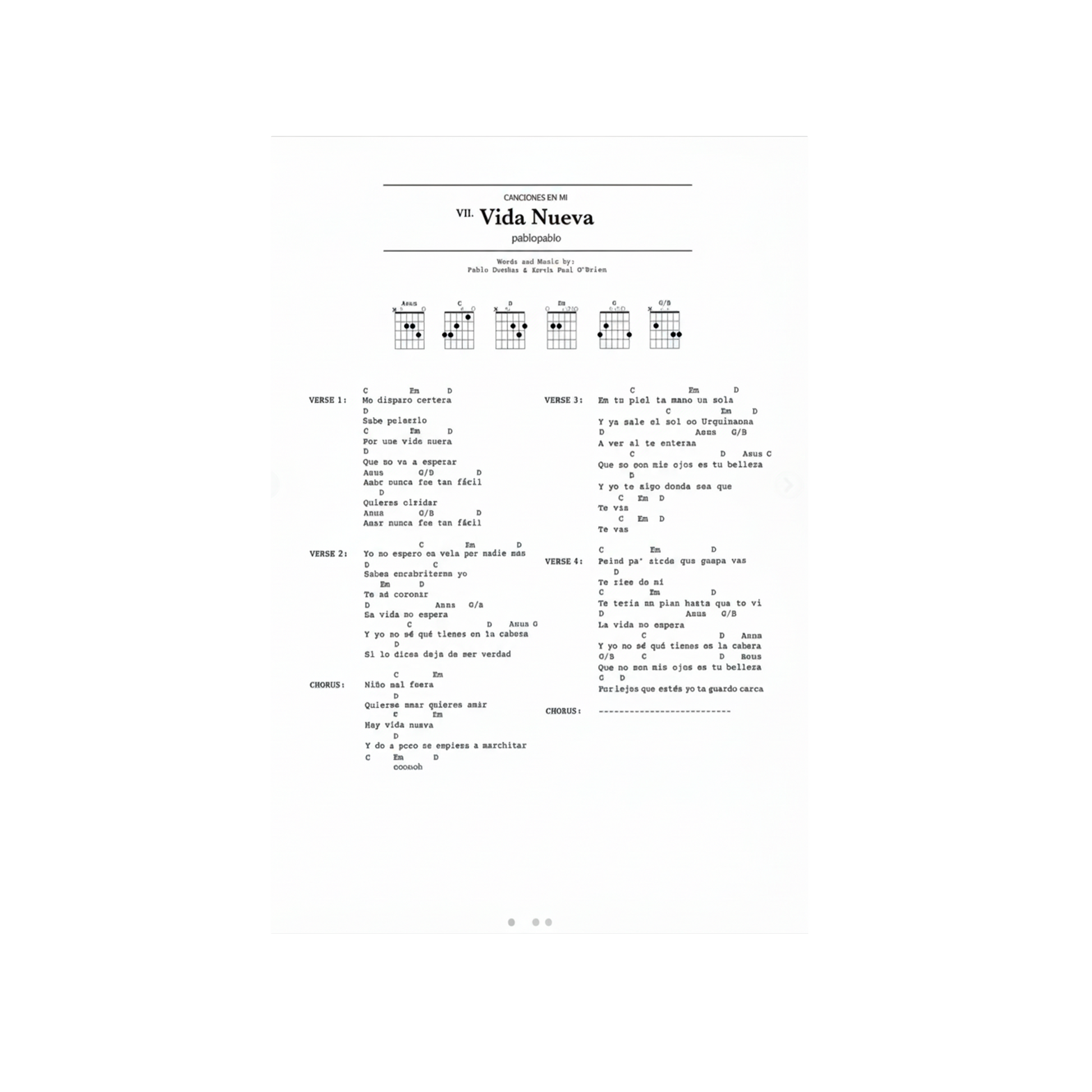 Cancionero de 32 páginas de 20 x 30 cm. Incluye partituras, tabulaciones y textos del álbum "Canciones en Mi".